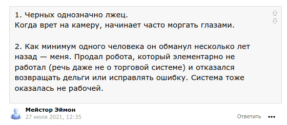 Разумеется, к этому времени Евгений уже провозгласил себя ГУРОЙ. Делается это достаточно просто: сначала дается множество торговых рекомендаций, а затем про неудачные забывается (доллар по 200 рублей), а про успешные постоянно напоминается. И добавив к этому обилие понтов, которые так любит Черных, получаем типичного инфоцыгана.